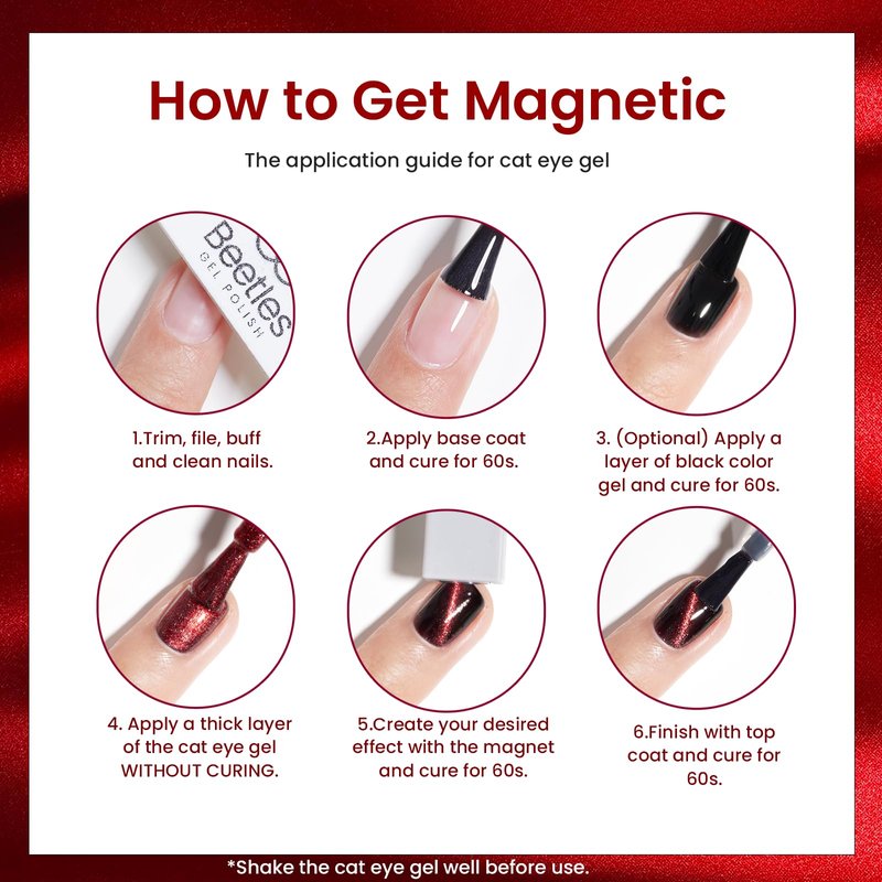 - 【Shimmery Pigmented Works of Art】 Before curing in the lamp, take the magnet and place it to your liking to achieve the desired effect; nail art takes a few seconds for the shimmers to achieve cat eye effect. Cure in the lamp for 60 seconds. Remember that the closer the magnet is to the nails, the better the result. This does not mean that you have to keep the magnet directly in contact with the polish.
