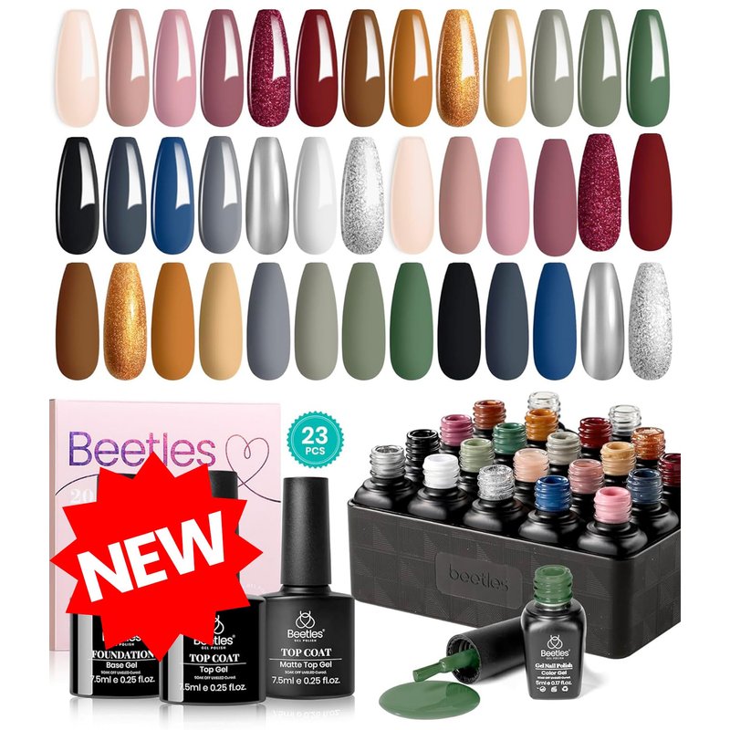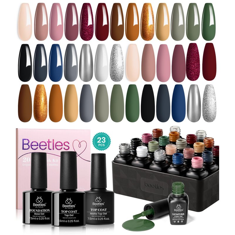 Beetles Gel Nail Polish Set 23 Pcs Nail Polish Nude Pink Black White Gray Red Gold Green Brown Blue Glitter Gel Polish Kit Uv Base Matte Glossy Top Coat Soak off All Season Gel Nail Polish