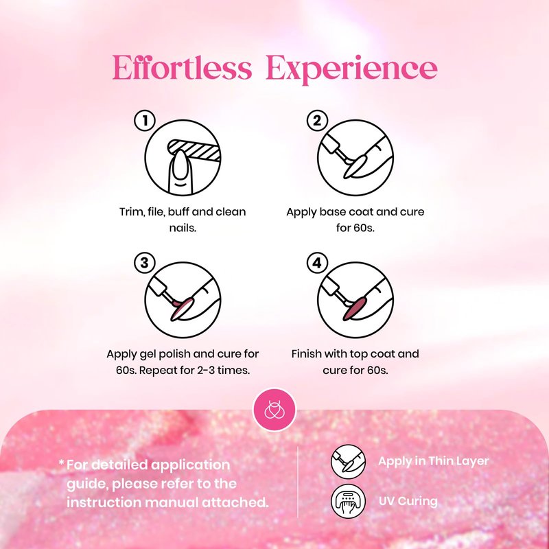 2. Base Coat: Apply thin base coat, cure under nail lamp for 60-90 seconds.