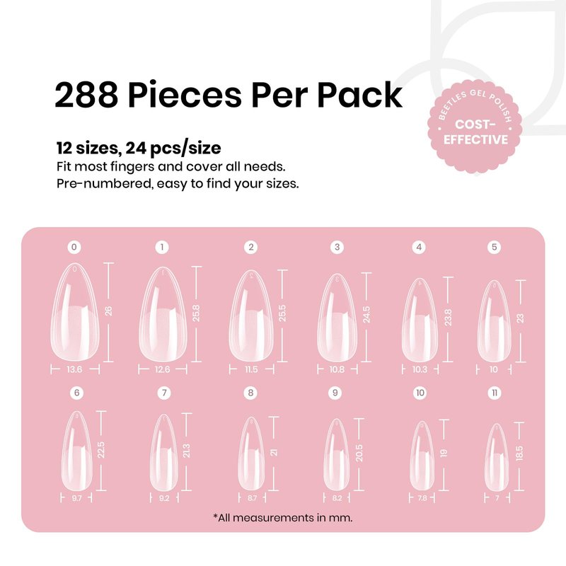 Be Bold, Be You, Be Beetles - 【No Shaping Needed】: Beetles nail tips choose inner half matte texture, with stronger friction, better fitting your natural nails. You can stick the full cover almond nail tips with nail glue directly, enjoy the privilege of “ NO NEED TO FILE ”. Also, the glue on nails is pre-shaped, saving time and effort. No worries that your nails will become thinner due to polishing, providing better care for your nails. - 【Fit Nails Perfectly】:This 288 PCS false nail tips set comes in 12 sizes for effortless matching to each finger. Each nail tip in the transparent series features a thinner edge to fit your natural nails. The pre-filed design reduces the need for extensive filing.Beetles nail tips offer a more natural appearance, resembling nails that have grown out naturally. - 【Premium Quality Nail Tips】:Crafted from premium PMMA, beetles almond fake nails tips offer an innovative natural wear feeling.The thickness of each nail tip is 2-4 times more than natural nail, providing sturdy and durable extended nails. Even if bent, it retains its original form without leaving marks, ensuring seamless nail application and design. - 【Easily Use】Extend your nails in mere 3 minutes and show them off for more than 28 days! Beetles soft gel nail tips can be used for gel nail polish, liner gel art, dip powder nails, poly nail extension gel, great for nails salon, DIY at home nail art. - 【Environmental & Healthy】: Beetles gel nail tips are made from environmental materials which makes it safe and has low odor. With good tenacity and highly pigmented, Beetles premium soft gel nail tips brings you brilliant shiny finish, smooth appearance and flawless coverage.