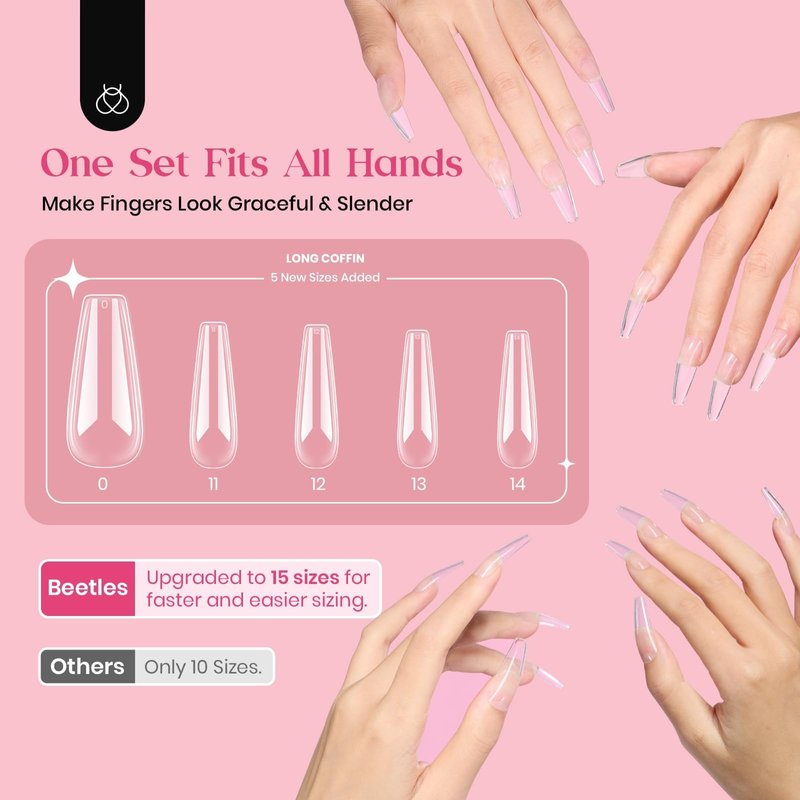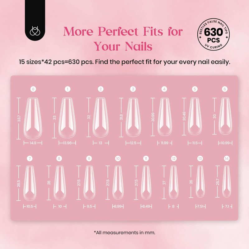 - 【Upgraded 15 Sizes】Beetles Long Coffin Gel Nail Tips upgraded to 15 different sizes, 630 pieces in total, our false nail tips give you even more options. The tips are marked with the numbers "0-14" to quickly find your size. Beetles full cover nail tips are easy to apply, suitable for professional manicurist and even nail beginners. Enjoy nail fun with your friends and family!