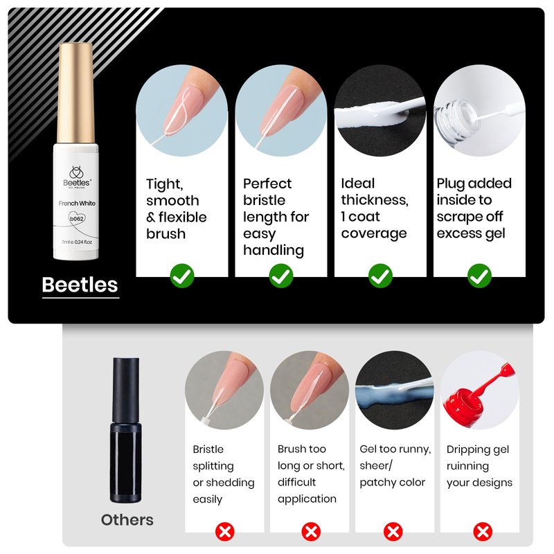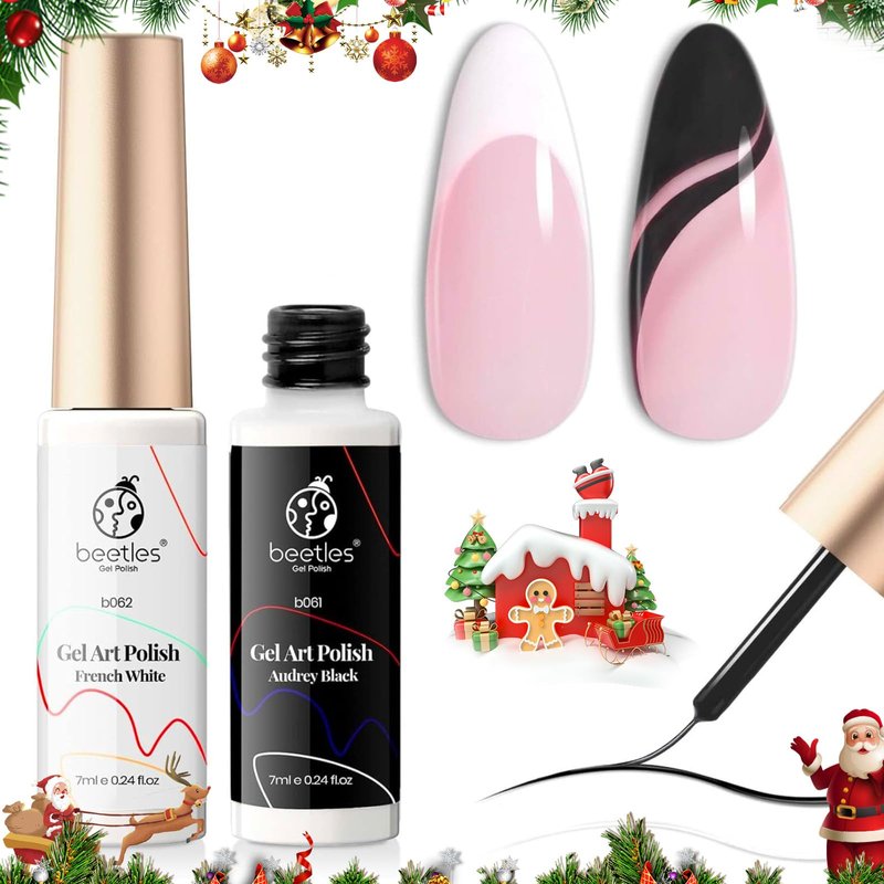 - Beetles Nail Art Polish Gel Liner Paint Set: Perfect for those trendy squiggly lines and French line! With the built-in thin brush, you don't have to get out your set of brushes for adding details and lines. Color Numbers are: b061-b062.