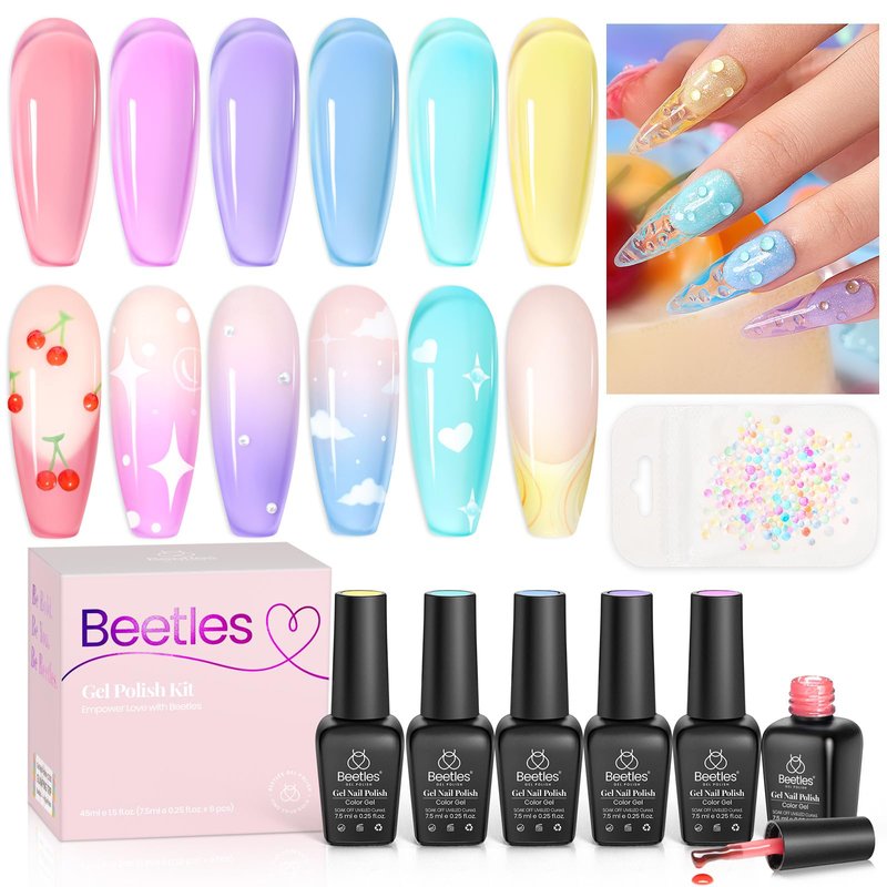 - Beetles Gel Nail Polish, 6 Colors Spring Summer Crystal Glass Translucent Pastel Gel Polish Blue Red Green Purple Yellow Jelly Gel Polish Soak Off UV with Mermaid Bubble Beads Nail Art DIY Home Salon