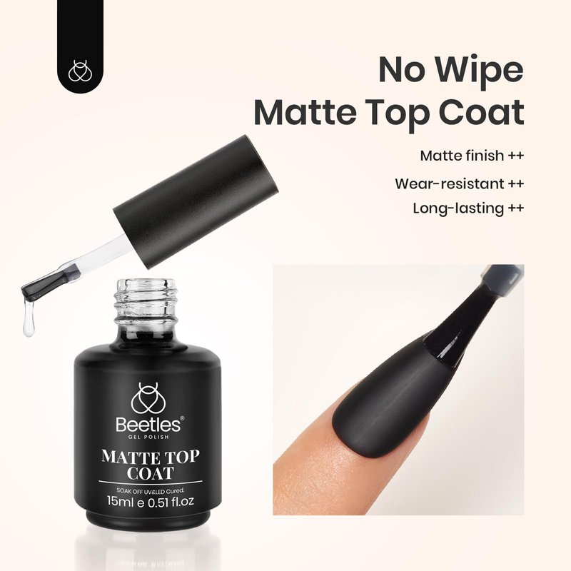 - Beetles Upgraded Matte Top Coat Gel No Wipe: Long lasting for 28+ days. Requires drying under an LED Lamp. Cure times vary per lighting system. If you experience any problems using this product, please contact us directly. We guarantee a fast replacement or refund service! The matte top coat is transparent. Color nail gel is not included!