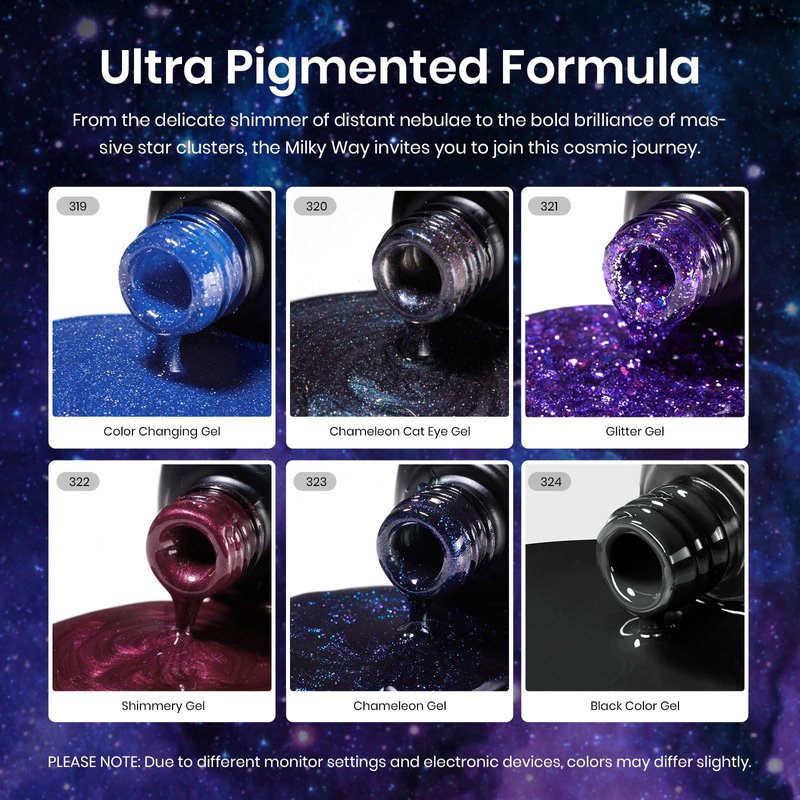 - 6 Color Collection Gel Polish (6*7.5ml/6*0.25fl.oz): Color Numbers are 319-320-321-322-323-324. This gel polish set is full of glitters and sparkles! Wear each color in the Milky Way set for a galactic mani that will earn you compliments! 319-Color Changing Temperature Gel, 320-9D Cat Eye Gel, 321-Chunky Glitter Gel, 322-Shimmery Burgundy Gel 323-Glitter Phantom Chameleon Gel, 324-Black Gel Polish. Tips: Place the magnetic stick over the surface about 3-5mm for 5-10 secs.