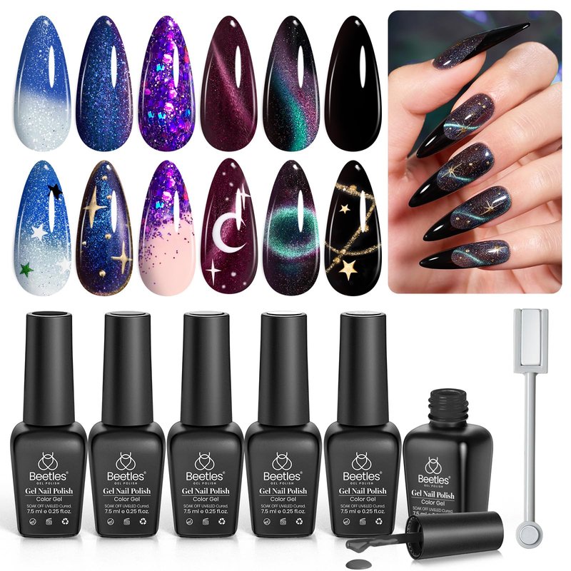Beetles Milky Way Glitter Gel Nail Polish Set - 6Pcs Black Purple Blue Galaxy Gel Polish Kit Soak Off UV Lamp Cat Eyes Magnet Color Changing Sparkling Phantom Chameleon Gel Gift for Women Girls