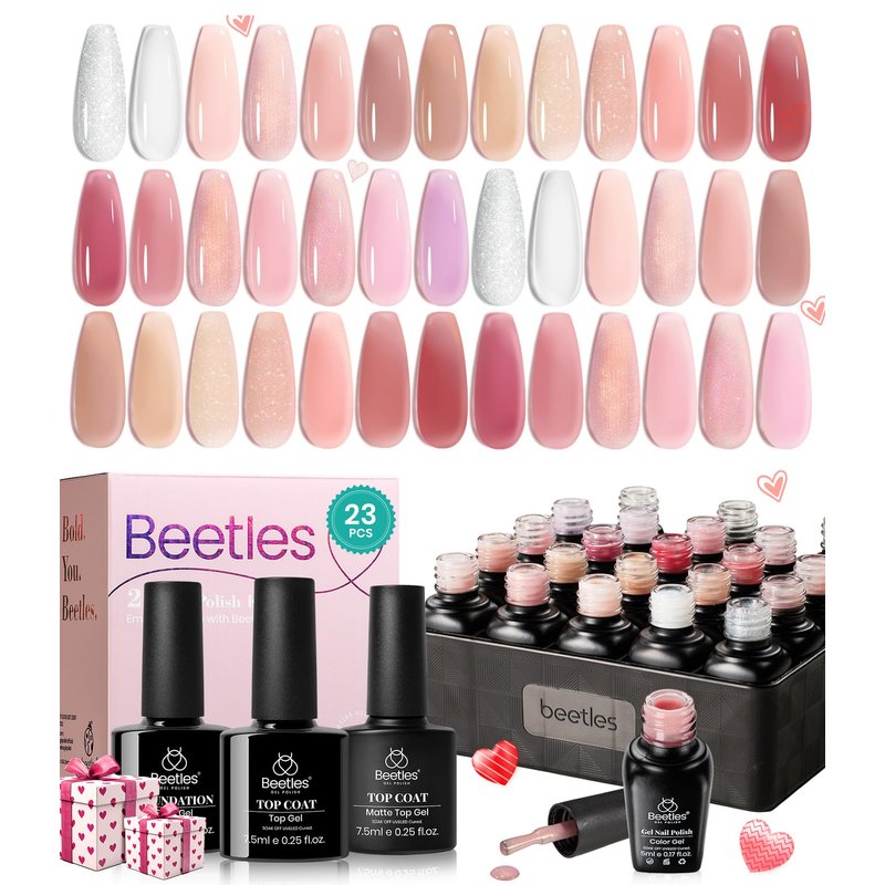 - What you Get: 20 Colors of 5 ml beetles jelly gel nail polish, 7.5 ml gel base coat, 7.5 ml*2 no wipe glossy and matte gel top coat, and nail art charms (Rhinestones and Pearls) *2. Nude gel nail polish gel is a semitransparent nail gel.