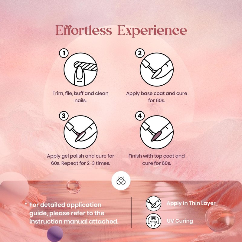 6.Apply thin color nail gel on nails. Cure for 60~90s. Repeat the above operation twice;