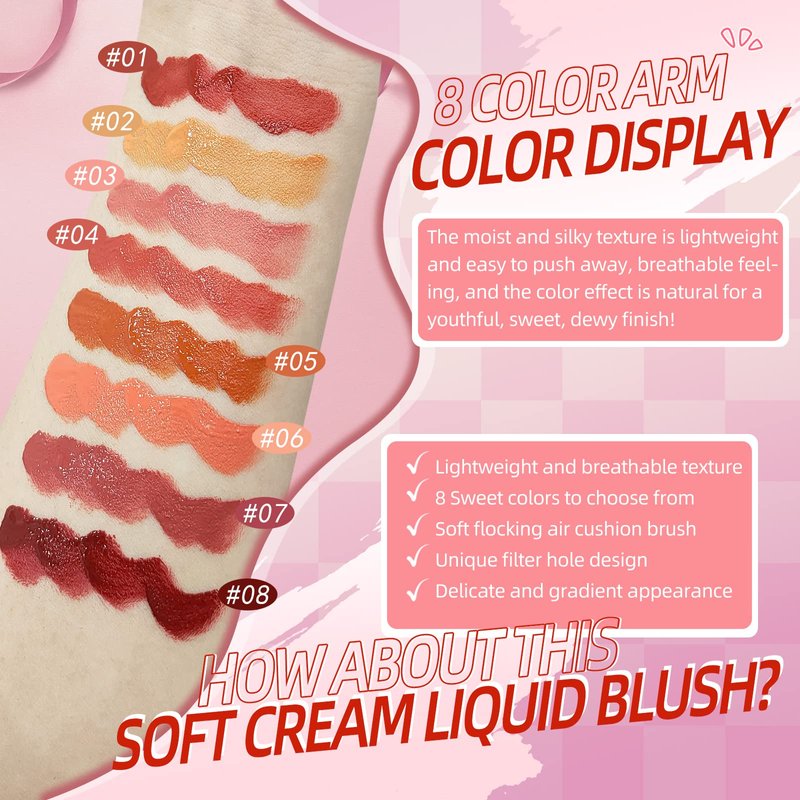 - 【Cream Liquid Blush】Achieve a fresh and glowing look with our liquid blush, which comes with a cushion sponge tip that makes application a breeze. Its dewy finish provides a subtle pop of color that can be built up gradually to create a natural-looking flush without accentuating texture, lines, or pores.