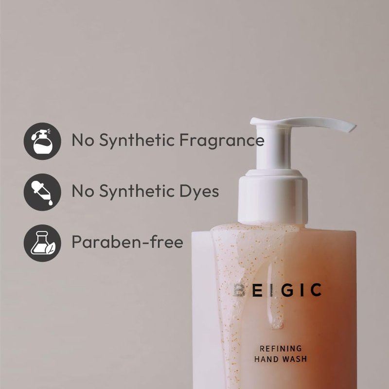 BEIGIC Refining Hand Wash offers a luxurious cleansing experience designed to leave your hands feeling smooth and refreshed. Infused with finely Ground Walnut Shell Powder, this hypoallergenic hand soap exfoliates rough skin and diminishes impurities, enhancing the texture and softness of your hands. The Soapbark Extract produces a rich and moisturizing foam that cleanses deeply without stripping the skin of essential oils, ensuring your hands stay hydrated and comfortable.