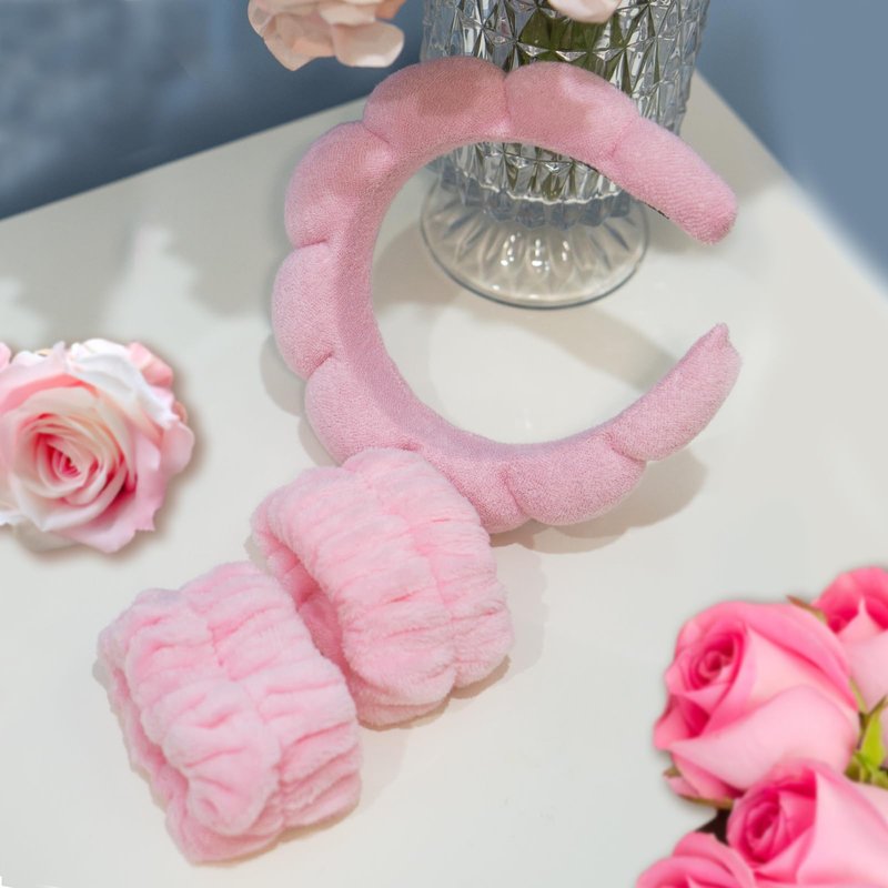 Beleki Spa Headband for Washing Face, Sponge Face Wash Headband and Wristband Set for Makeup Skincare Headbands Puffy Non Slip Headwear Hair Accessories for Women Girls, Pink