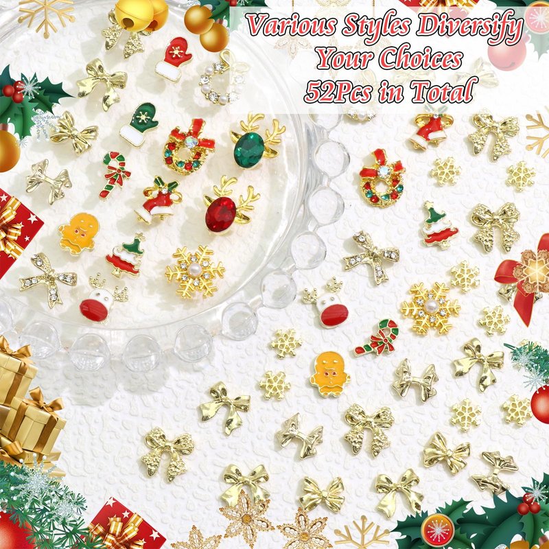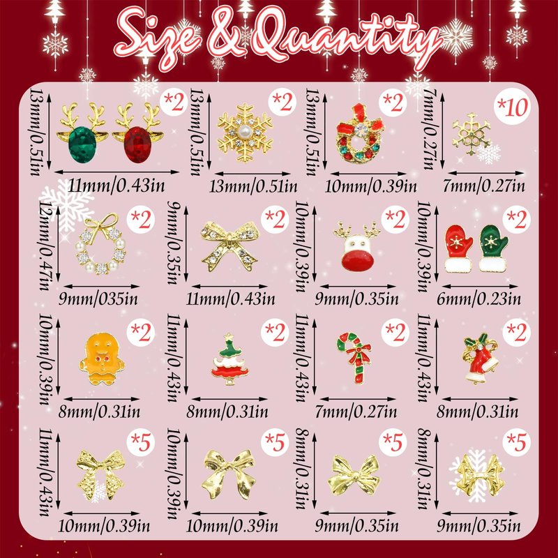 - What You Will Receive: You will receive a pack of Christmas Charms for Nails with bedazzling colorful gems set on it. Built-in various sizes and shapes, can meet your needs of holiday nail decoration. There are about 16 styles, 52pcs in total. Some of the elk nail charms also have big shiny red & green gems inlay, which is super eye-catching. These Bedazzling Christmas Charms are in variety of styles and large quantity, helping you easily create stunning and personalized Christmas nail styles.