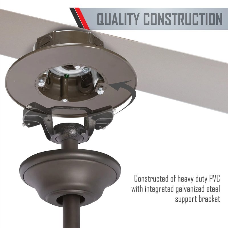 - STURDY SUPPORT: You get a solid mount for fans up to 70 lbs or heavy luminaires up to 150 lbs. Our outdoor junction box is made of heavy-duty PVC and an integrated galvanized steel support bracket.