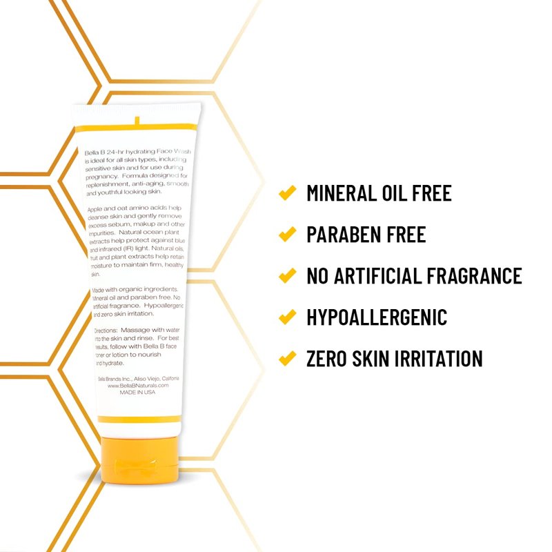Bella B 24-hr hydrating Face Wash is ideal for all skin types, including sensitive skin and for use during pregnancy. A formula designed for replenishment and anti-aging benefits for smooth and youthful looking skin.