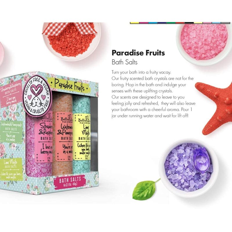 - FRUITY SCENT: Turn your bath into a fruity vacay. Our Paradise Fruits scented bath crystals are not for the boring