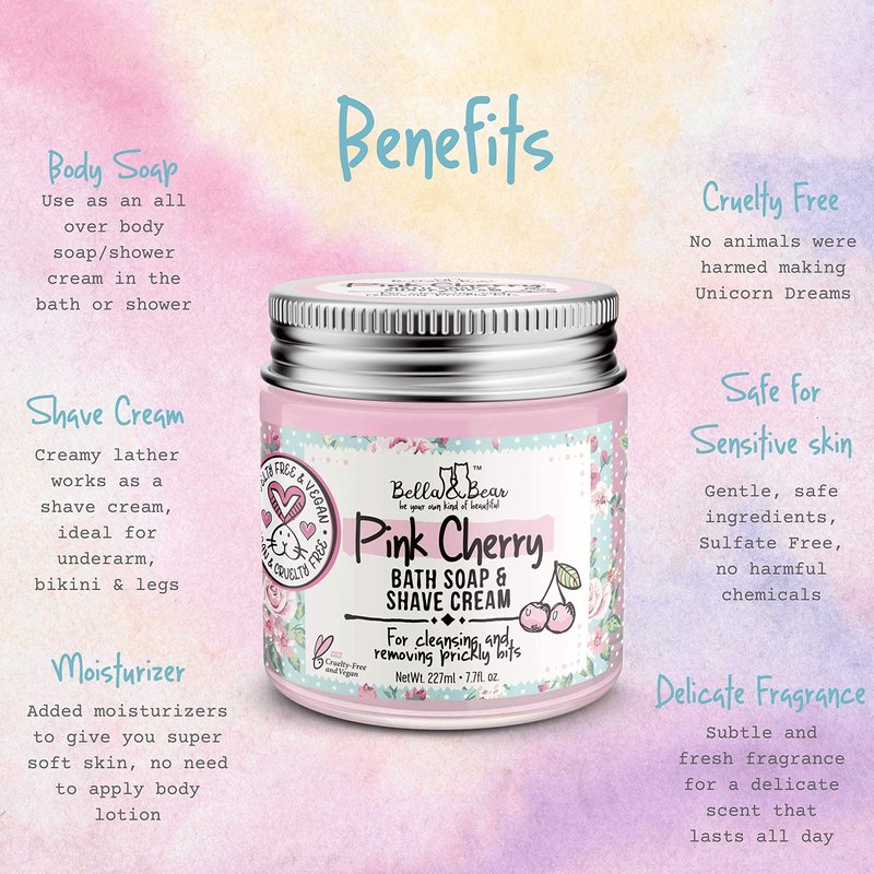 Bella & Bear Pink Cherry Bath Soap & Shave Cream, Paraben Free, No Harmful Chemicals, Cruelty Free, Vegan, 6.7oz