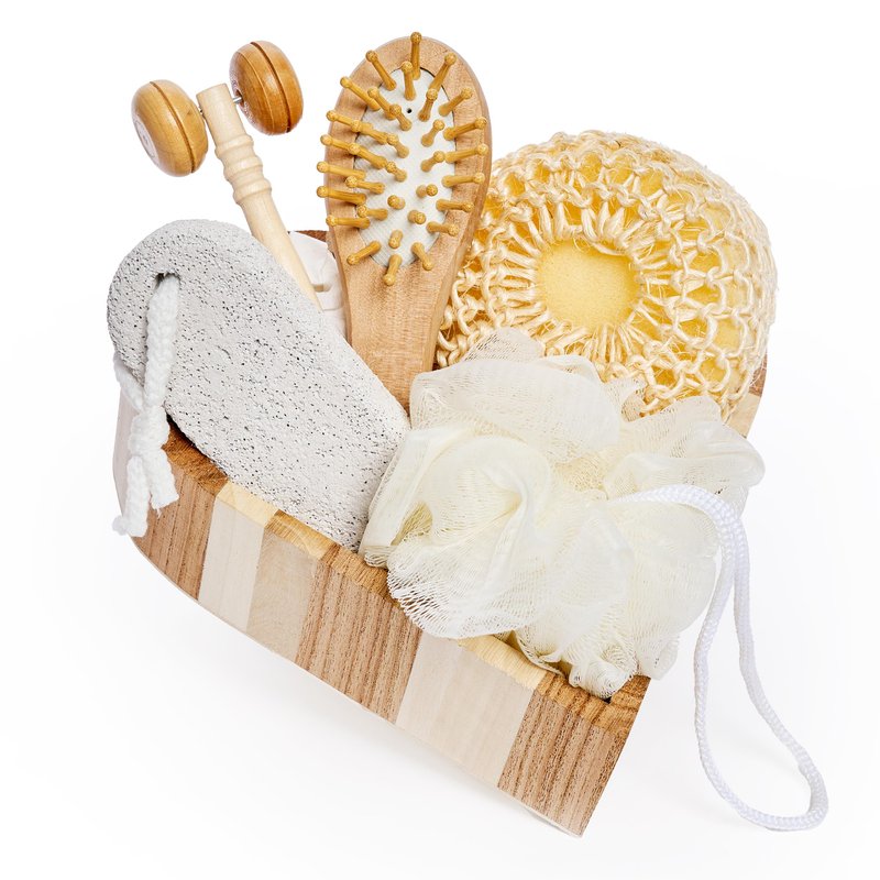 Bella Ciao Body and Skin Care Set, 6-PC, Face Massage Roller, Hair Brush, Pumice Stone, Loofah, Exfoliating Sponge, Wooden Tray Gift Basket, Bath and Body Gift Set, Birthday Gifts for Women