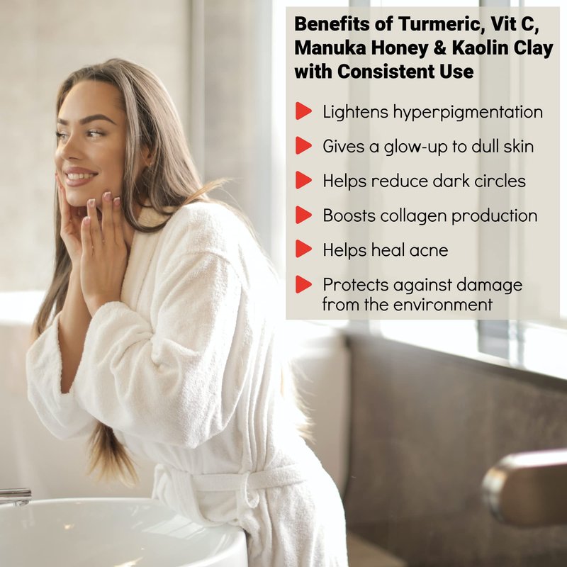 Bella Jade Turmeric Vitamin C Clay Face Mask & Brush for Acne, Hyperpigmentation, Dark Spots and Anti Aging - with Tumeric, Kaolin Clay, Organic Aloe Vera and Manuka Honey