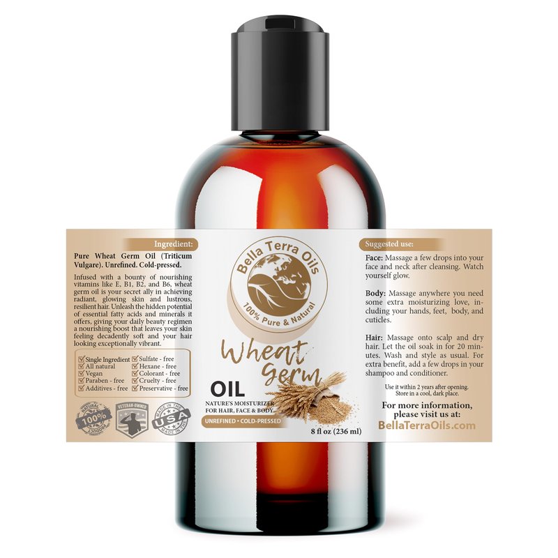 Bella Terra Oils - Organic Wheat Germ Oil 8 oz - Potent Vitamin E Oil for Skin, Celebrate Beauty with Essential Nutrients, The Pinnacle of Face Oils