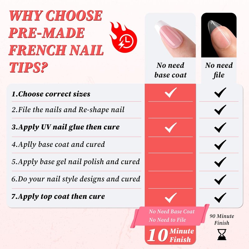 - Reusable press-on nails: natural french press on nail square are easily press and can be reapplied many times without losing their adhesion. Pick the suitable size, apply solid gel glue on the fake nail, then press on natural nails for 30s, then apply builder gel cure for 60s, at last apply top coat for 60s. then you will get a salon quality french on nail! Press on acrylic nail are easy to trim and decor, and it won't fade or break easily.