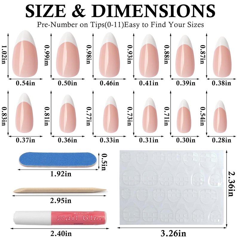 - Shiny glossy french tip press on nails kit, content 120pcs short almond press nails with a white french design, 2pcs strong nail glue, 5 sheets nail adhesive tabs, 1pc nail file, 1 wooden stick. No need to buy additional item, perfect for quickly nail art and save your money and time.
