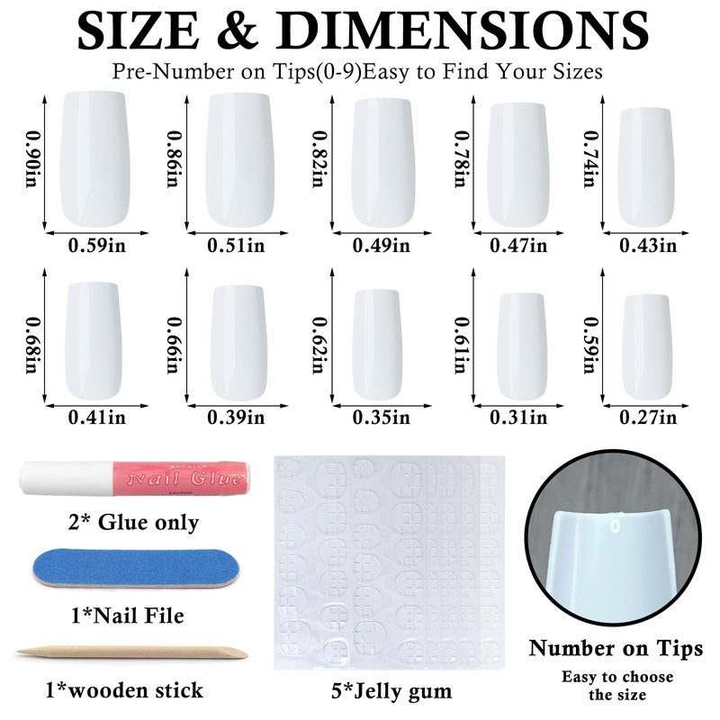 - Various sizes: cute square press ons have 10 different sizes for choice, and it inside pre-numbered 0-9, so even mixed together they are easy to track and find. The different sizes ensure that they fit most people's finger nail, whether your have a small or large nail hands, flat or slight curve nail bed.