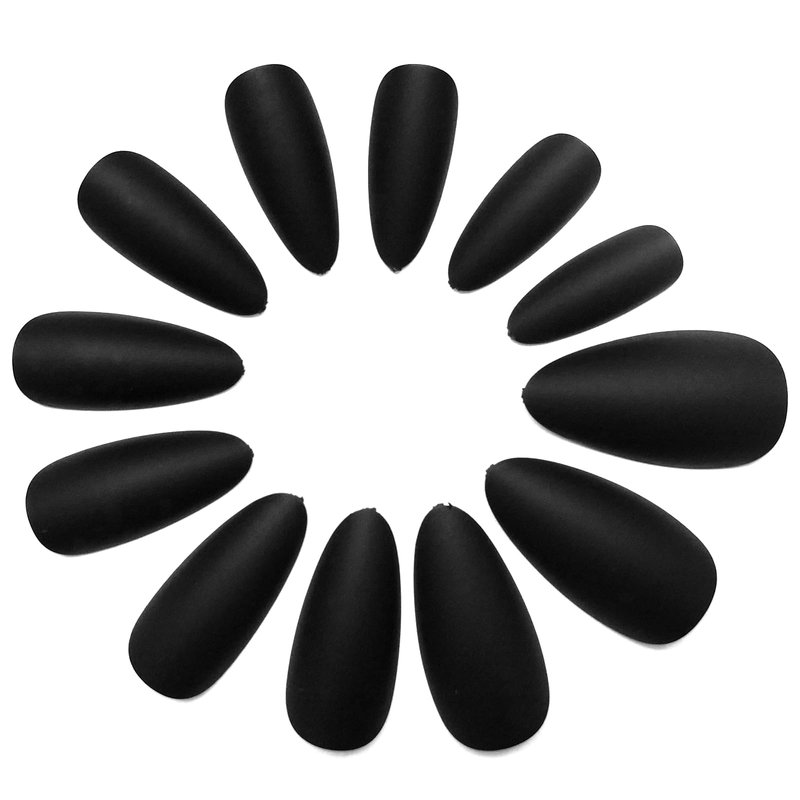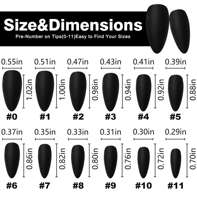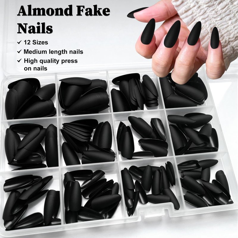 - Press on nails kit, content 240pcs black medium almond press on nails, 2pcs nail glue, 5 sheets nail adhesive tabs, 1 nail file and 1 wooden stick. Bellelfin full cover matte design black nails for women girls teens diy nails, this acrylic nails kit come with everything you need. Perfect for a quick home manicure, save your time and money.