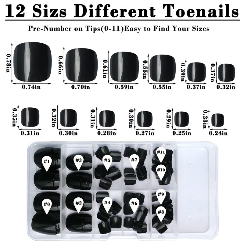 - Various sizes short toe nails press on: Short square toe press on nails have 12 different sizes, the toe nails are pre-numbered 0-11 and they are easy to track and find. Fashionable and charming artificial fake toe nails, make sure that they fit most people's feet nail, whether you have a small or large nail beds. Come to Bellelfin and choose the size that suits you best!