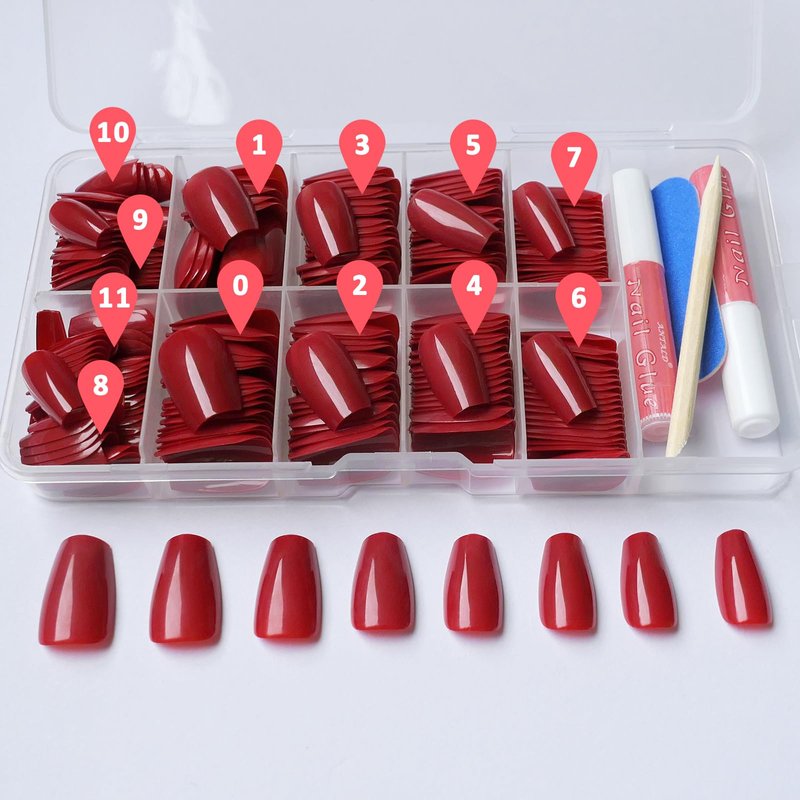Item including: 240pcs coffin red nails, 2* nail glue, 5 sheets nail adhesive tabs, 1*nail file, 1*wooden stick.