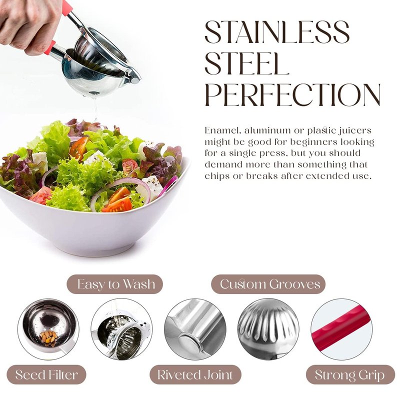 - STAINLESS STEEL PERFECTION: Enamel, aluminium or plastic juicers might be good for beginners looking for a single press, but you should demand more than something that chips or breaks after extended use. Bellemain juicers are 18/10 stainless steel so your juicer looks the same on the 100th day of making lemonade as it did on day 1-etch-free, rust-free, and simply marvelous.