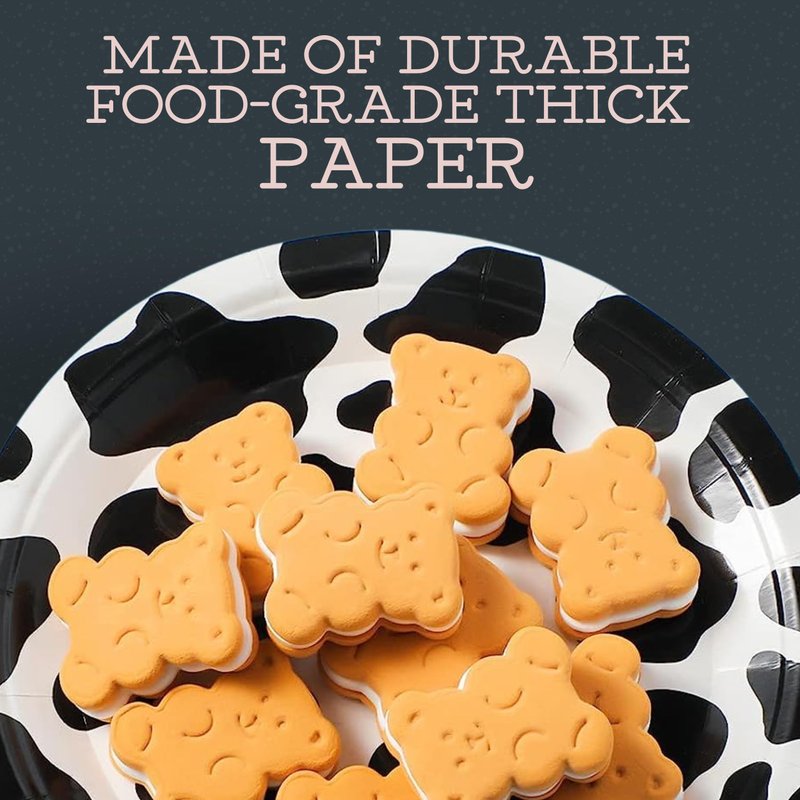 - The paper cow plates are made of durable food-grade thick paper material, has an incredible design that can be combined with any cow print party decorations. Our round plates won't bend, get wet or tear when carrying food, which will definitely provide you with a good using experience
