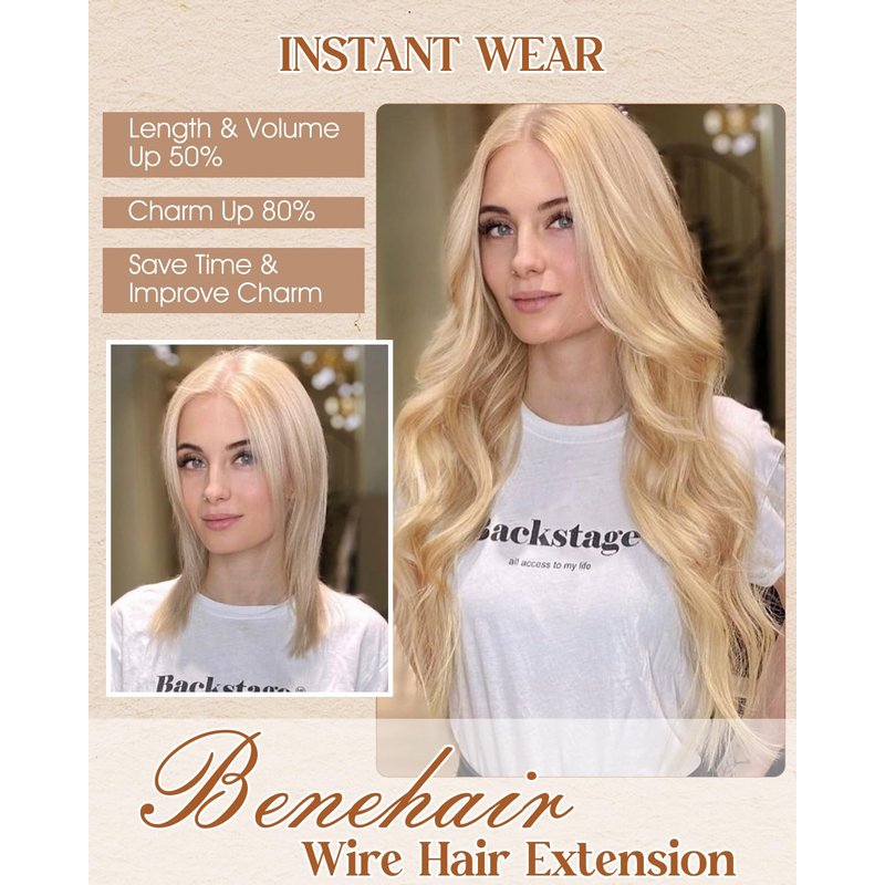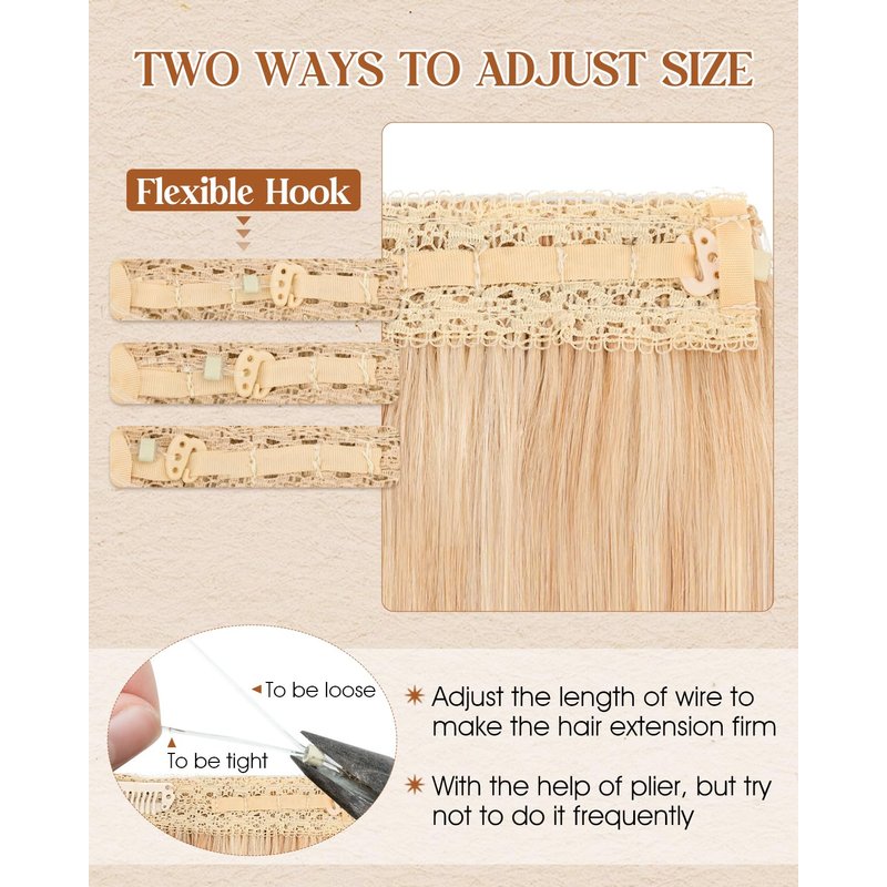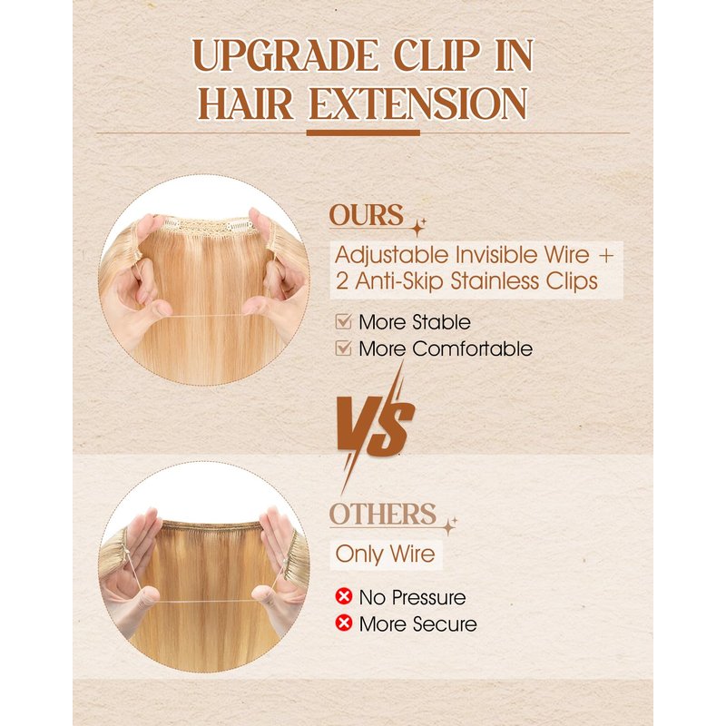 - The Easiest and Quickest Installation Way: Wire Hair Extensions are lighter and more comfortable. Unlike traditional clip-in hair extensions, they don't need any other accessory like clips, tapes, or glue. They are secured to your head with an elastic translucent wire that is covered by your own hair. Only a few seconds are needed to add volume and length.