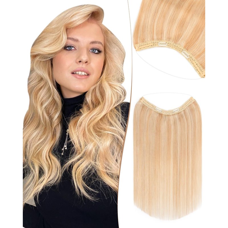 Benehair Halo Hair Extensions Real Human Hair 16 Inch Invisible Wire Hair Extensions with Fish Line Ash Blonde Mixed Bleach Blonde Halo Hair Extension 100% Human Hair Halo Extensions 60g #18&613