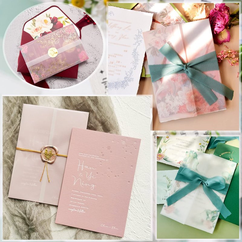 - HIGH-QUALITY VELLUM- Made of high-quality 93gsm vellum paper with a smooth surface and a solid feel. Will easily add an elegant and luxurious touch to your invitation cards and also provide a protection for them. The vellum jackets look beautiful with or without wax seals or ribbons