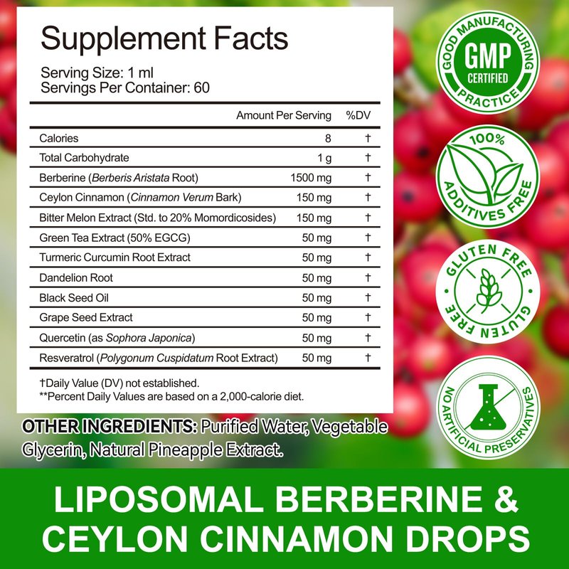 Berberine Supplement with Ceylon Cinnamon, Berberine Liquid Drops with Turmeric Curcumin, Ceylon Cinnamon, Bitter Melon,Immune Support, Digestive Health Support, 60ml