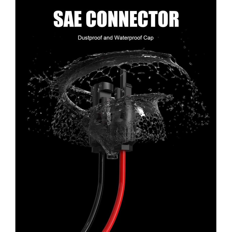 - 【Water【Waterproof & Dust-Proof Cap】The Sae Connector Has a Waterproof and Dustproof Cap, Keeps the Connector Against Raining and Dust, Makes The Connector Inside Clean & Dry When It Not in Use, Extending The Cable’s Service Time.proof & Dust-Proof Cap】The Sae Connector Has a Waterproof and Dustproof Cap, Keeps the Connector Against Raining and Dust, Makes The Connector Inside Clean & Dry When It Not in Use, Extending The Cable’s Service Time.