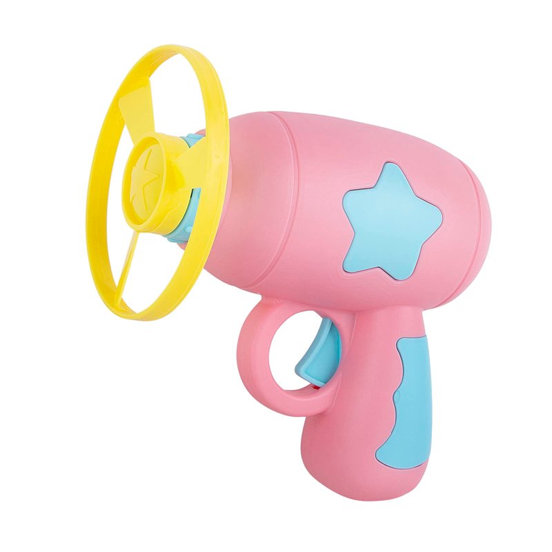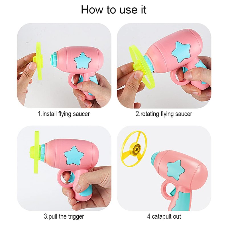 - [Unique Design] Flying saucers and gun toy are combined in a cool and novel way. It can bring a lot of happiness to children when they playing on the lawn. The product size: 10.5*5.5*13.5 cm.