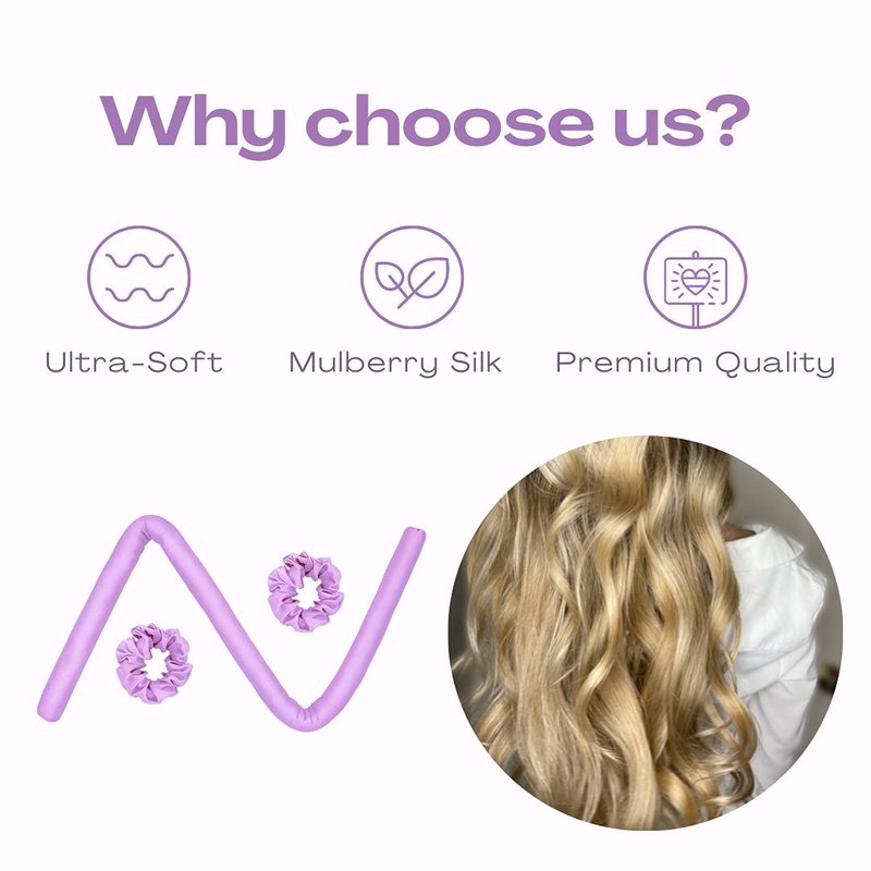 A revolutionary way to style your hair with no heat. Wake up every day feeling beautiful and confident. Taking care of your hair has never been easier because of our Mulberry Silk Heatless Hair Curler.Let your hair do the talking and take your beauty dream to the next level with this heatless curler that you can sleep on. Beach waves or princess curls, you can get the heatless waves of your dreams while you sleep.The BerrySilky heatless hair curlers are the answer to every healthy hair fan's dream, delivering flawless curls without the risk of heat damage to your hair. Our silk scrunchies combat hair breakage and those pesky hair curls that arise from traditional lower-grade fabric scrunchies for women. In addition to tackling breakage and split ends, our silk curler and silk hair scrunchies also remedy dry hair because silk made from genuine silkworms is a fabric that locks in moisture and increases the hair’s natural shine.The BerrySilky Heatless Hair Curler set comes with:1x Silk Ribbon Curling Rod2x Silk Scrunchies1x Instructions Card1x Satin Storage Bag