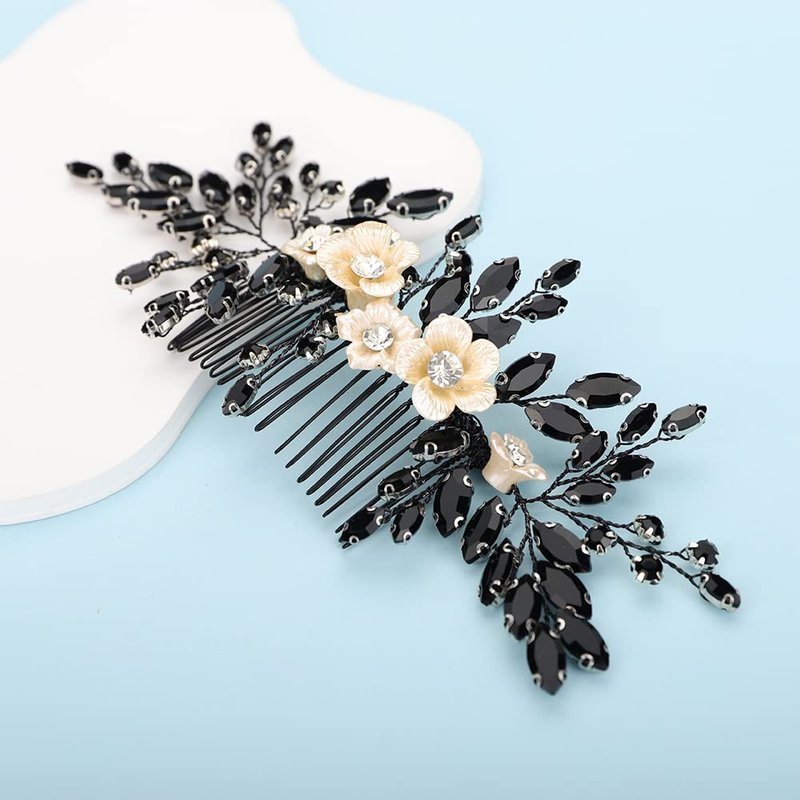 BERYUAN Bridal White Flower Black Crystal Rhinestone Hair Comb for Bride Bridesmaid Sliding side Headpieces Wedding Hair Accessories for Women and Girls (Black)