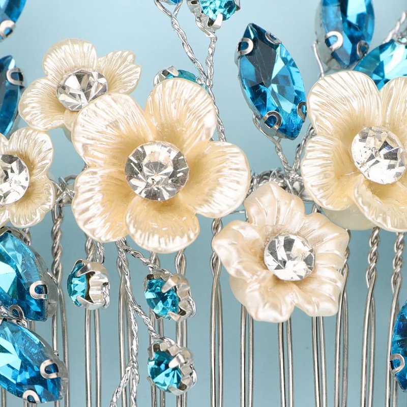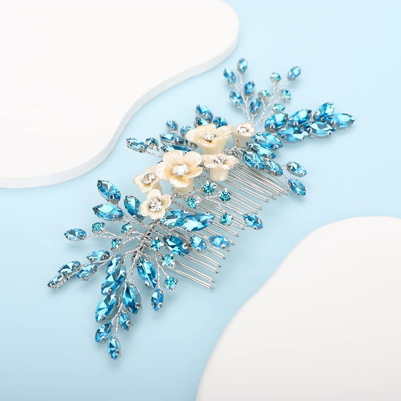 BERYUAN Bridal White Flower Light Blue Crystal Rhinestone Hair Comb for Bride Bridesmaid Sliding side Headpieces Wedding Hair Accessories for Women and Girls (Blue 1)