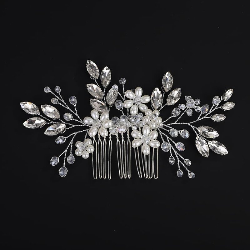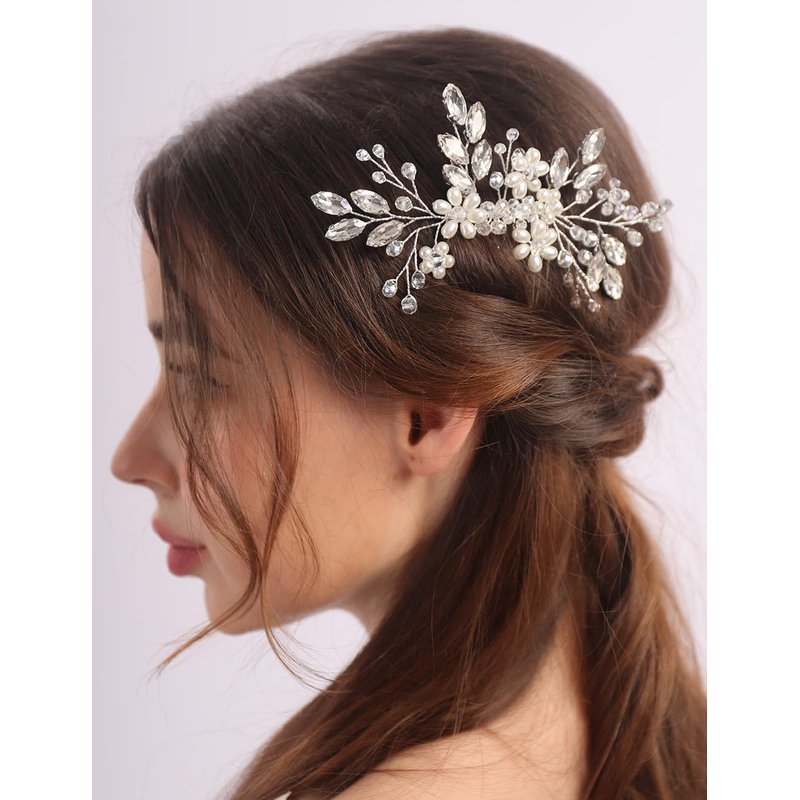 - Materials:Crafted with care,the rhinestones and crystals sparkle brilliantly,while the pearls and flowers add a touch of elegance and sophistication. Dimensions: The rhinestone pearls wedding headpiece is 5.9inch in length,3.1inch in width.