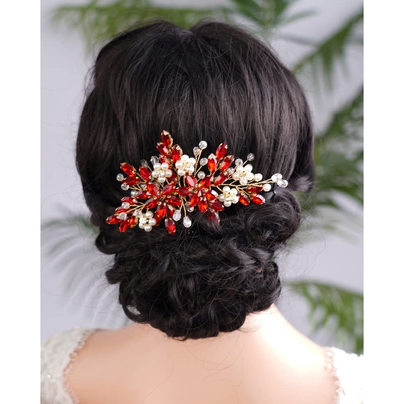 BERYUAN Wedding Pearls Crystal Rhinestone Hair Comb Pearls Crystal Flowers Bride Headpiece Red Wine Crystal Pearls Wedding Hair Accessories Handmade Wedding Hairband for Wedding Women and Girls (red
