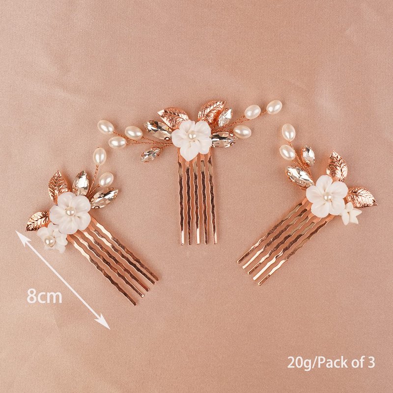 BERYUAN Wedding White Flower Rose Gold Leaf Pearls Crystal Rhinestone Hair Comb Pearls Teardrop Rhinestone Hair Piece Bride Headband for Bridal Women and Girls(3PCS) (rose gold)
