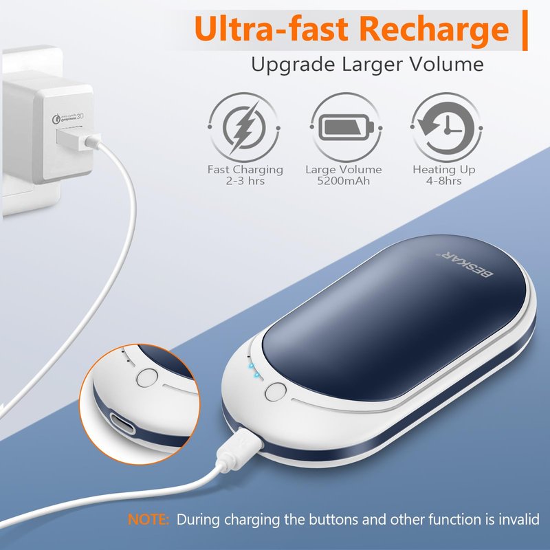 BESKAR Rechargeable Hand Warmer, 5200mAh Electric Handwarmers with Long Lasting Heating, Quick Charge and 3 Levels, Portable Pocket Hand Warmer & Power Bank for Outdoors, Camping, Golf, Raynauds