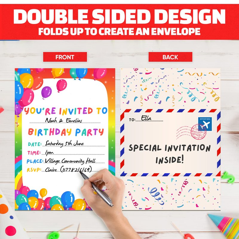 - FOLDING ENVELOPE DESIGN: These invitations have been cleverly designed with a doulbe sided print, so that once you have written on them, you can fold them closed and they will look like an envelope. The envelope has a super cool "Air Mail" style design and on the back it features a confetti pattern to really set the party mood!