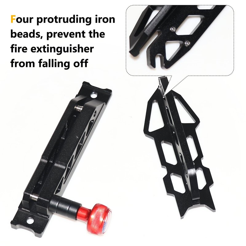 Attach the fire extinguisher bracket to the roll rack by adjustable rings, no drilling.The fire extinguisher bracket has four protruding iron beads to prevent the fire extinguisher from falling off.