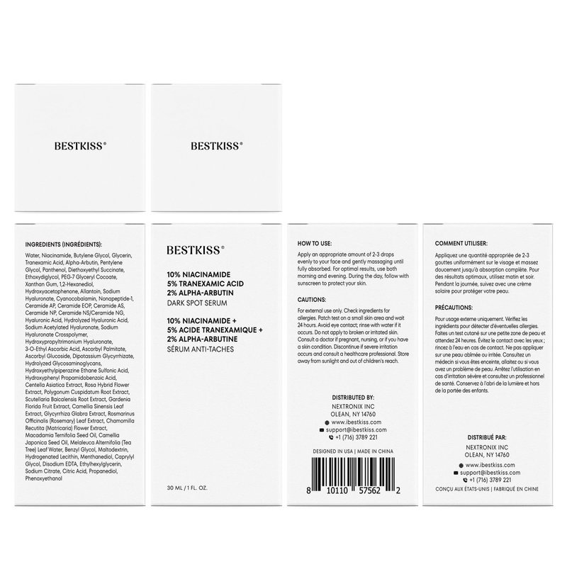 - Introducing Bestkiss Dark Spot Remover for Face: expertly formulated with 10% Niacinamide + 5% Tranexamic Acid + 2% Alpha-Arbutin, a powerful trio of ingredients to target dull skin and enlarged pores for face and body. Infused with Ceramides and Hyaluronic Acid to protect damaged skin barrier, soothe and hydrate the skin. Our serum is gentle enough to be used daily, morning and night. Achieve radiant Korea Glass Skin with Bestkiss!