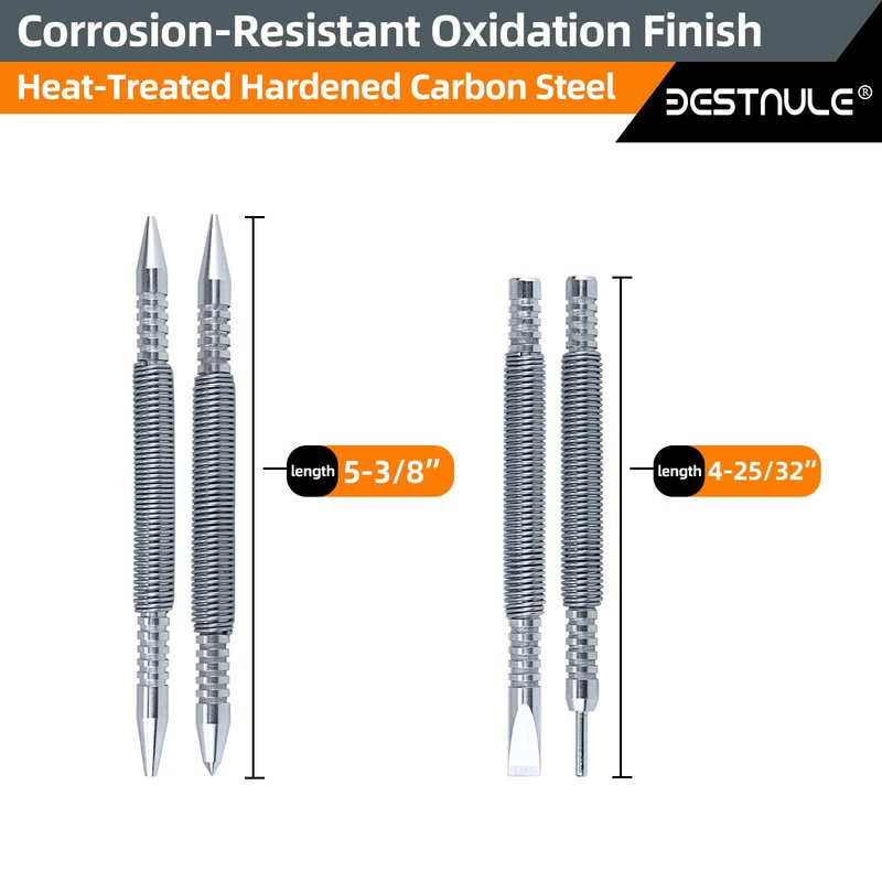 - 🔧【Durable to Use】: This nail setter equipped with a corrosion-resistant oxidation finish, this precision-machined nail set is made of heat-treated, hardened carbon steel to withstand wear and weather. The spring-loaded design of this set eliminates the need for a hammer, making these tools a must-have for any worker.