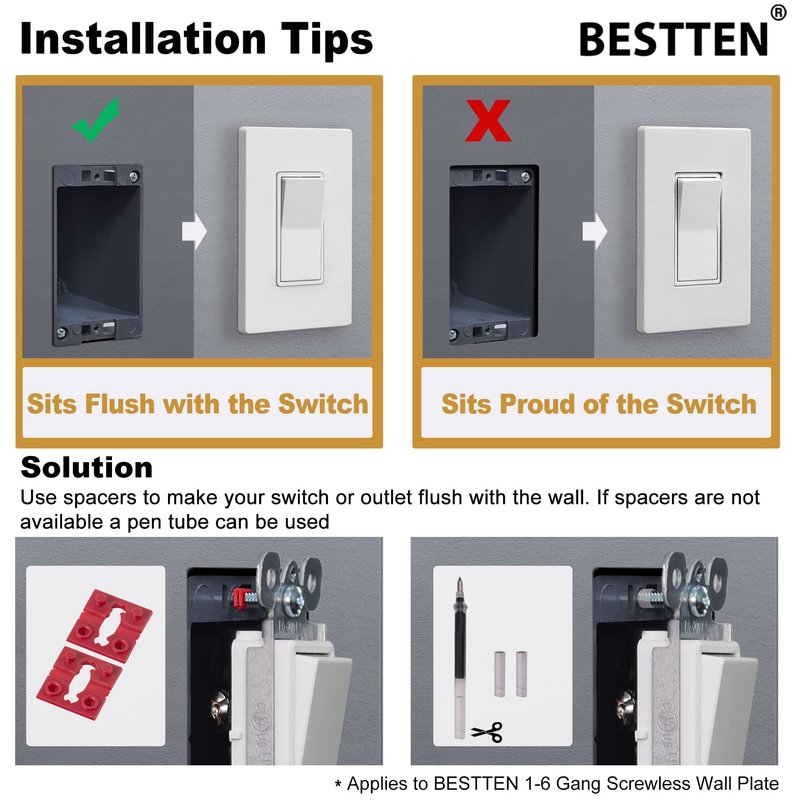 - Compared to sandwich designs from other brands, BESTTEN screwless wall plates have no seam along the edge for a smooth look that won't collect dust