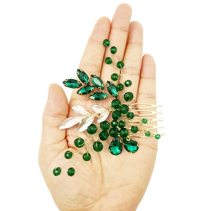 BETITETO Crystal Bridal Hair Comb Wedding Gold Vine Leaf Rhinestone Hair Piece Accessories for Women Girls (Green)